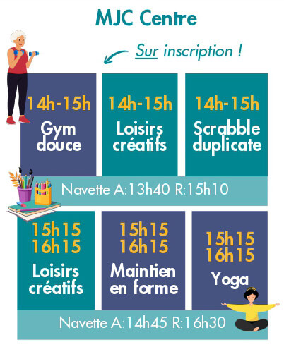 Rejoignez-nous sur place pour découvrir nos activités à l’année : Gym douce, Loisirs créatifs, Scrabble duplicate, Maintien en forme et Yoga !