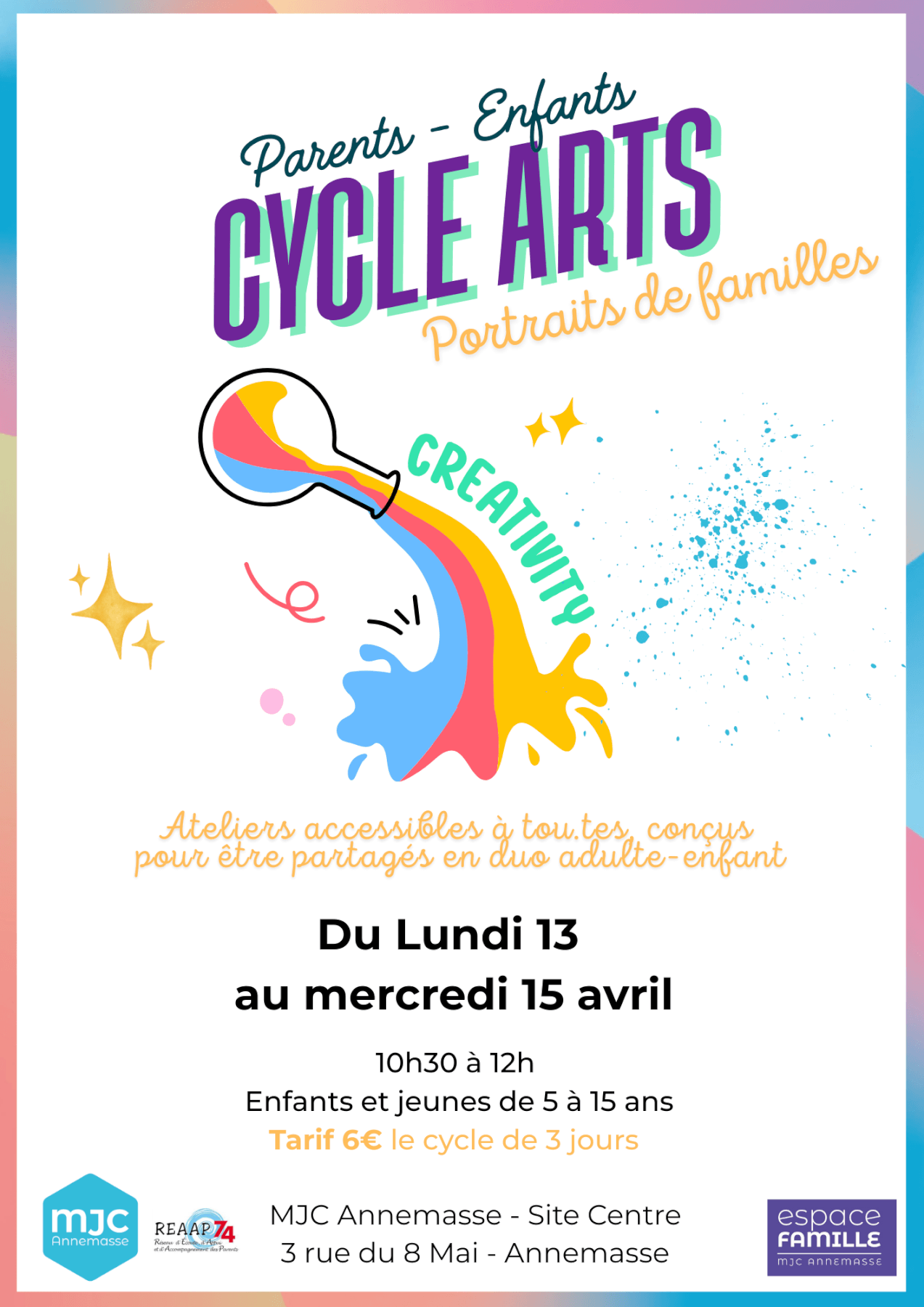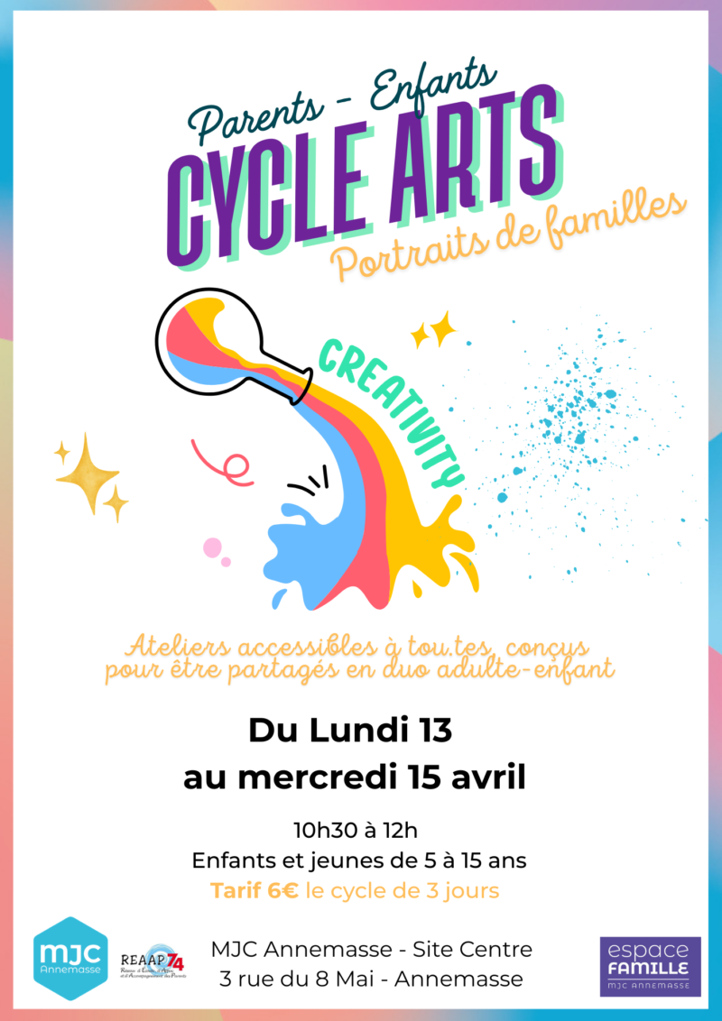 Ce cycle sera l’occasion de laisser libre court à la créativité de votre enfant tout en réveillant la vôtre ! Chaque séance sera l’occasion de partager et de produire une œuvre en collaboration pour créer votre portrait de famille !